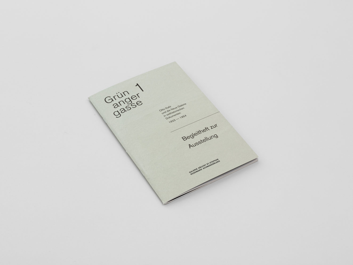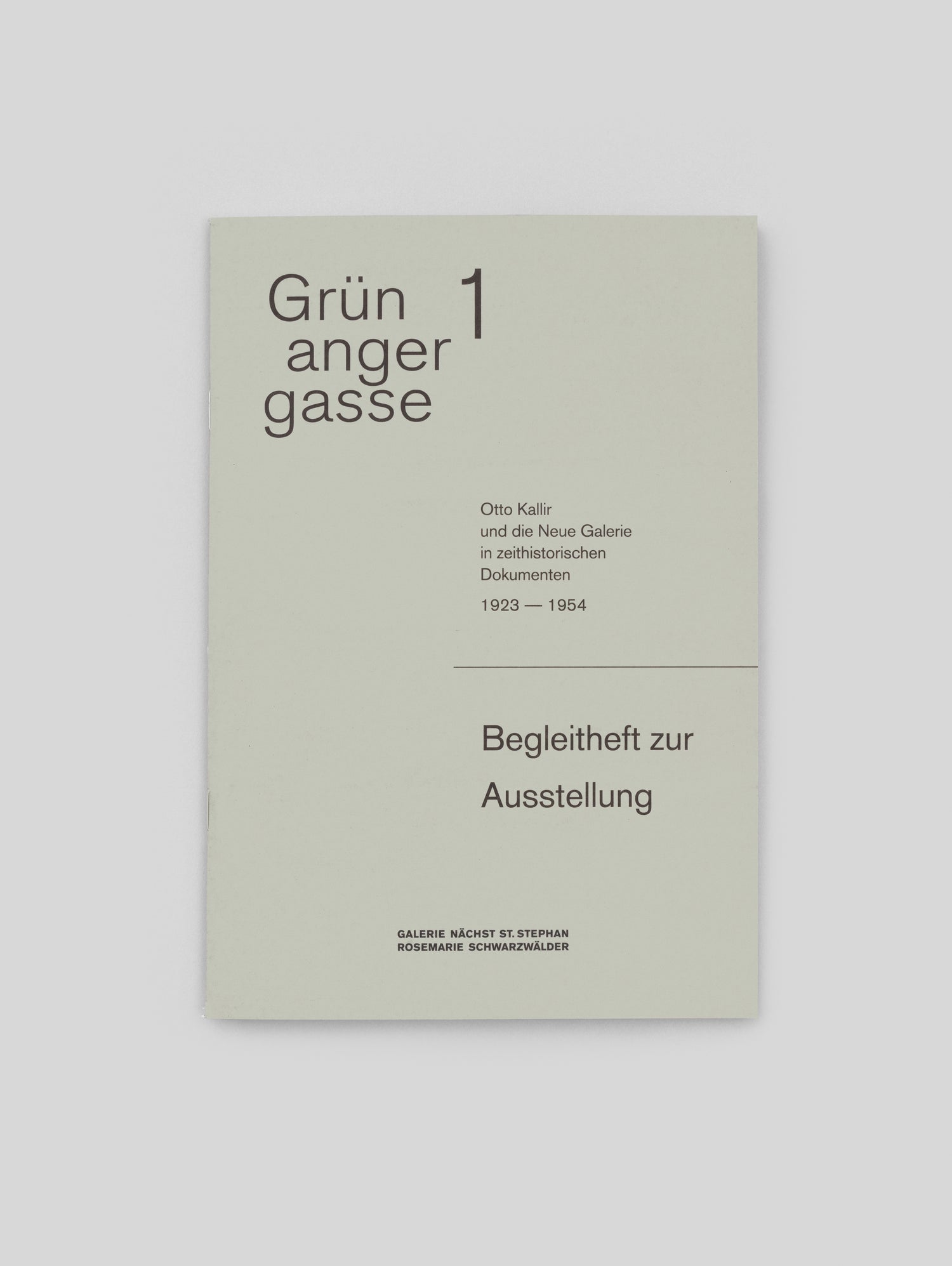 Die Broschüre dokumentiert die Ausstellung Grünangergasse 1. Otto Kallir und die Neue Galerie in zeithistorischen Dokumenten 1923-1954, Galerie nächst St. Stephan Rosemarie Schwarzwälder, Wien, 2023.