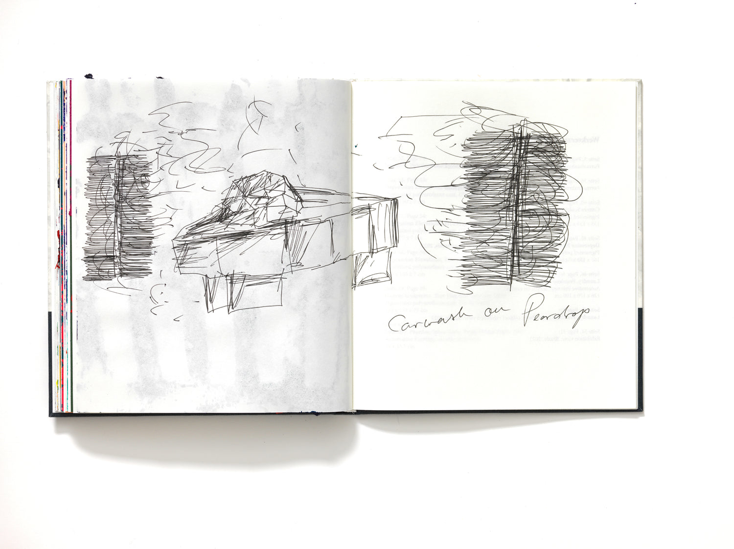 Each book in this series is a unique copy. All flexographic prints have been applied directly to their pages by Daniel Knorr. They are imprints made from the widest range of silicone molds collected by the artist: on the streets of Berlin, in the Garzweiler open mine, at the Feldherrenhalle in Munich, in Hong Kong Disneyland, landscapes of the moon, from the Pont Neuf in Paris to the Bökelberg Stadium, which was demolished in 2006, every print includes an aspect of history. The photographs for each book were printed out by different people on different printers and then both cut into shape and pasted to the appropriate page by the artist’s own hand. All graphic works were drawn by hand specifically for each copy.